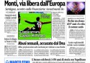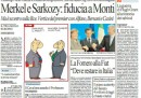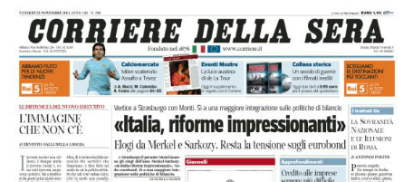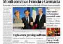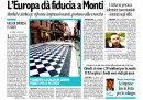 La maggior parte delle prime pagine di oggi apre con le notizie dell’Europa: durante l’incontro trilaterale a Strasburgo Angela Merkel e ha definito “sehr beeindruckend” (tradotto dai giornali italiani con “impressionanti”) le riforme che il nuovo governo italiano si prepara a varare. Mentre l’aggettivo è celebrato dai quotidiani maggiori, il Giornale accusa Monti di essersi inginocchiato davanti agli altri leader europei, Libero di aver discusso di riforme di cui il popolo italiano è ancora all’oscuro; la Padania in particolare dice che il governo è “fuori di testa”. La Merkel, però, non ha cambiato idea sugli Eurobond e sul ruolo della Banca Centrale Europea, sottolinea l’Unità. Ancora l’Unità e il Manifesto, invece, parlano della chiusura di Termini Imerese, con immagini dei 2200 lavoratori dello stabilimento Fiat.