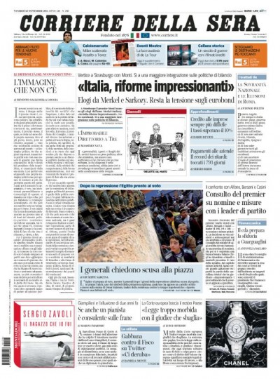 La maggior parte delle prime pagine di oggi apre con le notizie dell’Europa: durante l’incontro trilaterale a Strasburgo Angela Merkel e ha definito “sehr beeindruckend” (tradotto dai giornali italiani con “impressionanti”) le riforme che il nuovo governo italiano si prepara a varare. Mentre l’aggettivo è celebrato dai quotidiani maggiori, il Giornale accusa Monti di essersi inginocchiato davanti agli altri leader europei, Libero di aver discusso di riforme di cui il popolo italiano è ancora all’oscuro; la Padania in particolare dice che il governo è “fuori di testa”. La Merkel, però, non ha cambiato idea sugli Eurobond e sul ruolo della Banca Centrale Europea, sottolinea l’Unità. Ancora l’Unità e il Manifesto, invece, parlano della chiusura di Termini Imerese, con immagini dei 2200 lavoratori dello stabilimento Fiat.