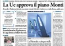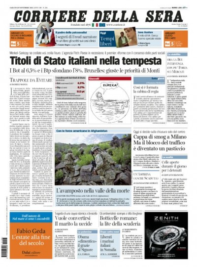 Le prime pagine di oggi aprono con le notizie sull’economia e dall’Europa: l’andamento dei mercati è pessimo, il Corriere informa che i titoli di Stato italiani sono “nella tempesta”, e la maggior parte delle testate cerca di consolare i lettori con la piena fiducia nel governo Monti, espressa ieri dal commissario Ue per gli Affari economici Olli Rehn. È la nota di Palazzo Chigi, che fa sapere che Angela Merkel e Nicolas Sarkozy sono consapevoli che se crolla l’Italia crolla anche l’euro, ad avere successo sulla maggior parte dei quotidiani. La Stampa riporta le parole del governatore della Banca d’Italia Ignazio Visco che invita a investire sui giovani, i cui salari sono fermi ad alcuni decenni fa, mentre i giornali vicini alla ex-maggioranza esprimono le loro critiche al nuovo governo: la Padania, addirittura, prevede che non arriverà al 2013.