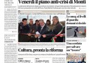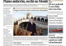 Le prime pagine di oggi aprono con vari argomenti. I quotidiani maggiori parlano ancora di Europa e delle riforme di Monti: il Sole 24 Ore e la Stampa si occupano degli accordi tra Merkel e Sarkozy e del piano del Fondo Monetario Internazionale per salvare l’Italia; la Repubblica e il Corriere, invece, anticipano le misure presenti nel piano di riforme del governo, parlando di Ici, mini-patrimoniale, pensioni. L’Unità sottolinea che la mancanza di Silvio Berlusconi al governo ha reso possibile un’intesa su Termini Imerese e il Manifesto e Liberazione mostrano le immagini del ritorno in piazza dei movimenti per l’acqua pubblica. I giornali vicini alla ex-maggioranza continuano a esprimere un forte dissenso e dubbi sulla squadra di governo e su Mario Monti, visti i ritardi nell’approvazione delle riforme e il cattivo andamento dei marcati: Libero si chiede se i ministri siano dei “bidoni” e la Padania se il Presidente del Consiglio “ci è o ci fa”. I quotidiani sportivi celebrano la vittoria della Juventus contro la Lazio, in attesa dello scontro diretto col Napoli.