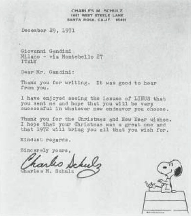 Firmammo il contratto e lui mi regalò la fotocopia di una striscia con Lucy. Io credo che l’abbia firmala, Gina sostiene che ci mise una firma a timbro. Ma eravamo felici. Potevo tornare a Milano e concentrarmi con Renata sulla traduzione di Popeye. Di lì a poco il primo numero di Linus apparve nelle edicole. Fu una tiratura bestiale di oltre 50.000 copie e, quando ne parlammo nel salotto verde, con Vittorini, eravamo tutti d’accordo che non sarebbe durato. Io non avevo più francobolli, non dormivo la notte, ma poi arrivò il primo tremila per l’abbonamento e, come dice un’amica di Palau, quando guardi il cassetto alla sera e ti accorgi della fresca che è arrivata, qualcosa ti dà il coraggio di tirare avanti. Anche se, come dice John Irving in Il mondo secondo Garp, siamo tutti dei casi disperati.