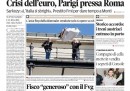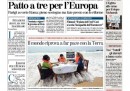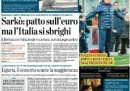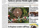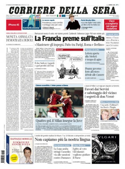 Le prime pagine di oggi aprono ancora (e naturalmente) con le notizie dall’Europa: il Corriere e la Repubblica titolano con una nota dall’Eliseo, con la quale il presidente della Repubblica francese Nicolas Sarkozy ha incalzato il governo italiano a fare “quel che deve” per salvare l’Italia dalla crisi, ribadendo che se crolla l’Italia, crolla anche l’euro. La Stampa sottolinea invece che l’Italia, insieme a Francia e Germania, svolgerà un ruolo da protagonista in Europa in occasione della revisione dei trattati. L’altra notizia, a cui dà rilievo l’Unità, è che ieri Silvio Berlusconi ha parlato in pubblico dicendo di essere già al lavoro per le elezioni, parlando dei “comunisti” e assicurando un’alleanza con la Lega, prontamente smentita dal leghista Roberto Calderoli. Le testate sportive celebrano la vittoria schiacciante (4-0) del Milan sul Chievo e raccontano del pugno che Osvaldo, attaccante della Roma e della Nazionale, ha dato al compagno di squadra Lamela dopo la partita di venerdì contro l’Udinese.