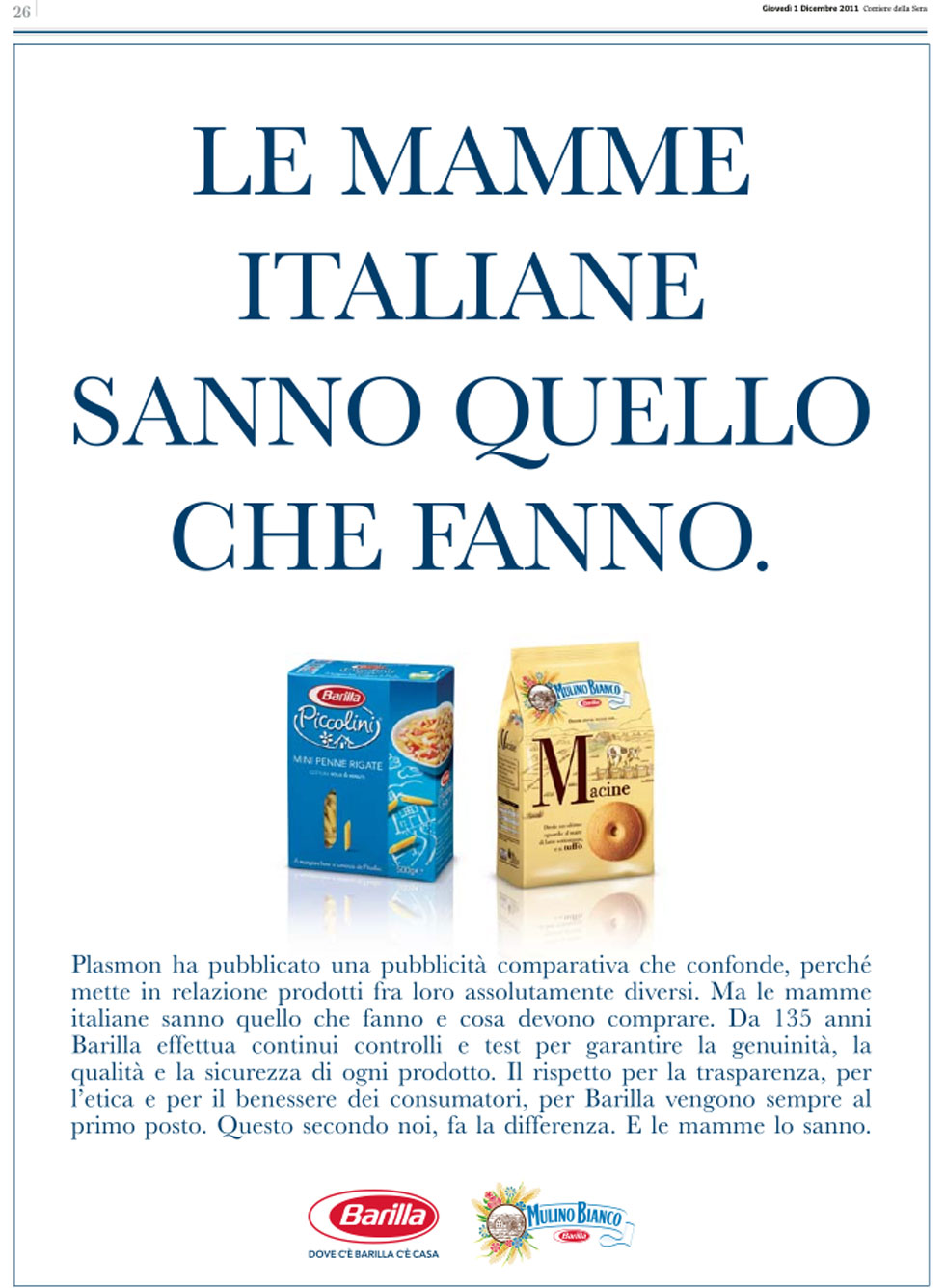 Plasmon ha pubblicato una pubblicità comparativa che confonde, perché mette in relazione prodotti fra loro assolutamente diversi. Ma le mamme italiane sanno quello che fanno e cosa devono comprare. Da 135 anni Barilla effettua continui controlli e test per garantire la genuinità, la qualità e la sicurezza di ogni prodotto. Il rispetto per la trasparenza, per l’etica e per il benessere dei consumatori, per Barilla, vengono sempre al primo posto. Questo secondo noi fa la differenza. E le mamme lo sanno.