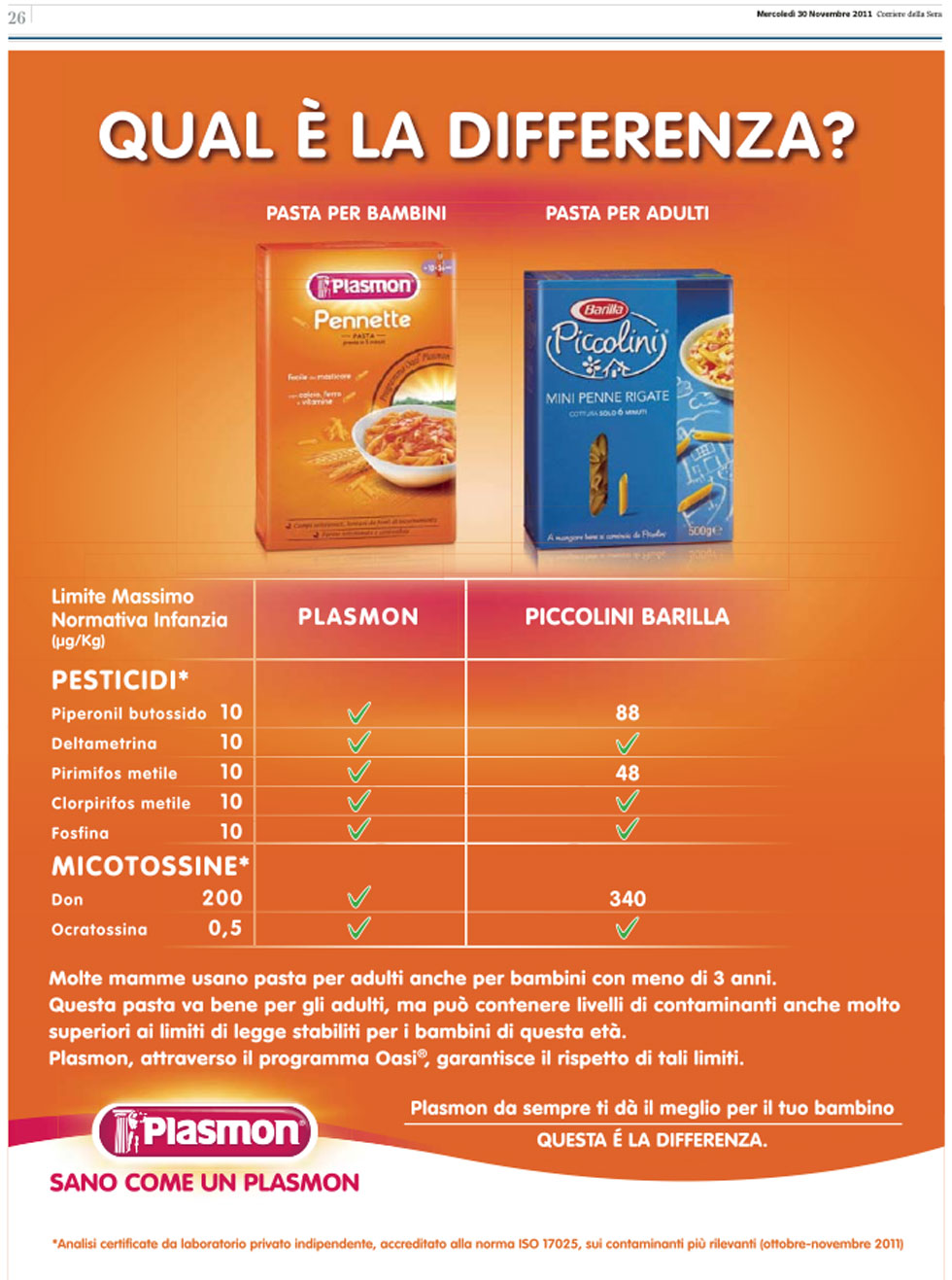 Ieri la Plasmon, società produttrice di prodotti alimentari, ha pubblicato su alcuni quotidiani un annuncio pubblicitario comparativo, nel quale vengono confrontate le proprietà della sua pasta con quella del marchio Piccolini della Barilla. L’annuncio inizia con la domanda “Qual è la differenza?” proponendo poi una tabella in cui viene mostrata la presenza nei Piccolini di pesticidi e altre sostanze che non li rendono adatti ai bambini da zero a tre anni.