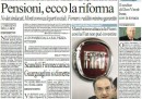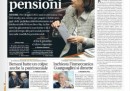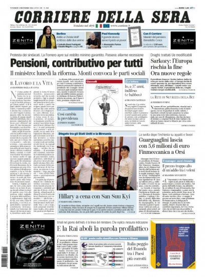 La maggior parte delle prime pagine di oggi apre di nuovo sul tema delle pensioni dopo le dichiarazioni di ieri a Bruxelles del ministro Elsa Fornero. Il Corriere parla di contributivo per tutti, il Manifesto, invece, di reddito minimo garantito che sembra essere compreso nella riforma. La Stampa e l’Unità danno spazio alla promessa di Monti di incontrare la parti sociali, che fino a questo momento davano segni di nervosismo per non essere state ancora convocate. Le immagini dei quotidiani sono non solo per il ministro Fornero, ma documentano anche l’incontro storico tra il segretario di Stato Usa Hillary Clinton e il premio Nobel per la Pace San Suu Kyi.