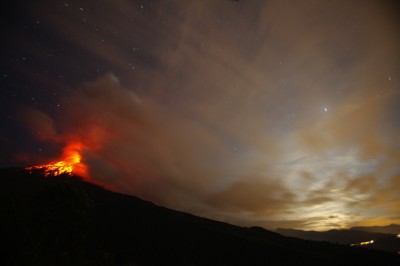 View of the Tungurahua Volcano throwing incandescent rocks and lava, from the town of Runtun, Ecuador, on December 4, 2011, 135 km south of Quito. A reactivation of the eruptive process of the Tungurahua volcano, forced authorities to increase from yellow to orange the alert in the surrounding areas. AFP PHOTO Pablo COZZAGLIO. (Photo credit should read PABLO COZZAGLIO/AFP/Getty Images)
