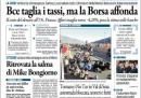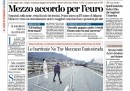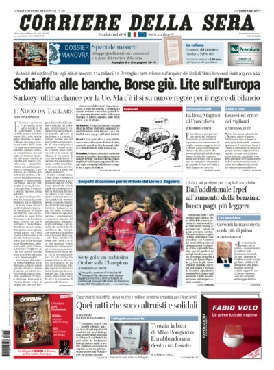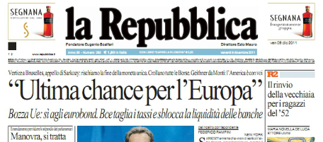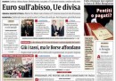 Le prime pagine di oggi aprono con le notizie economiche e dall’Europa: mentre il Corriere pone in primo piano il pessimo andamento della Borsa di ieri, nonostante il taglio dei tassi da parte di Mario Draghi, la Repubblica, l’Unità e il Riformista parlano del vertice di Bruxelles, ricco di tensioni e conclusosi con la decisione di un’Europa “a due velocità”, sottolineando il momento decisivo per il futuro della moneta unica. I toni sono praticamente unanimi, e tutti parlano di “ultima chance” o “ultima possibilità” per salvare l’euro. La Padania e Libero aprono invece (ancora) con la manovra del governo Monti, predicendo un prelievo forzoso. Su quasi tutte le testate è riportata anche la notizia del ritrovamento della salma di Mike Bongiorno, trafugata qualche mese fa.