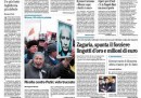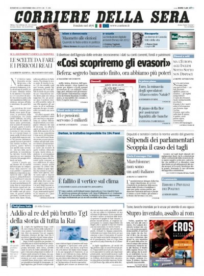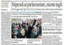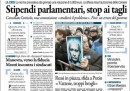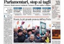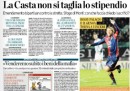 La maggior parte delle prime pagine di oggi parla delle indennità dei parlamentari: la commissione Affari istituzionali della Camera farà modificare la norma sui tagli degli stipendi. La reazione dei quotidiani, soprattutto di Repubblica, Libero, la Stampa e il Giornale, è di ferma condanna e spunta (ancora) la parola “casta”. Mentre il Corriere pubblica le dichiarazioni del direttore dell’Agenzia delle entrate che, grazie alla fine del segreto bancario, promette di scoprire più facilmente gli evasori e l’Unità pubblica un’intervista con Massimo D’Alema, il Manifesto si occupa, invece, di politica estera e dà spazio alle agitazioni di Mosca di questi giorni. Le pagine sportive sono quasi sollevate dalla vittoria dell’Inter, che torna a vincere a contro la Fiorentina.