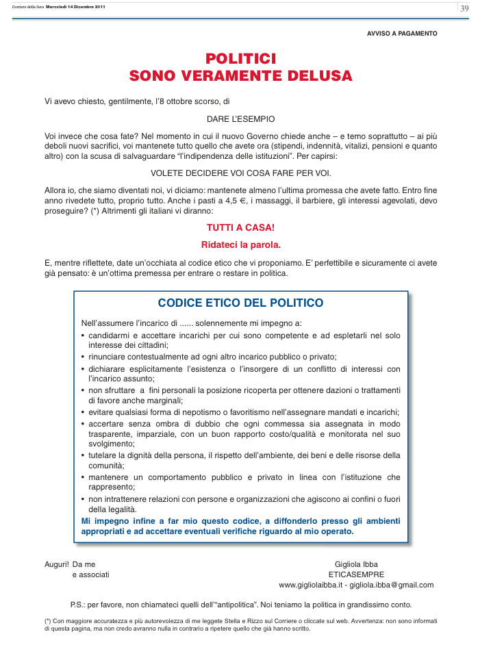 Gigiliola Ibba è una ex dirigente di un’agenzia di comunicazione che a ottobre seguì il primo esempio di Diego Della Valle di acquistare una pagina sul Corriere della Sera per protestare contro l’inadeguatezza dei politici italiani in quel momento. Dopo ha aperto un sito, e oggi ha occupato una nuova pagina del Corriere con un altro messaggio.