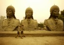BAGHDAD, Iraq: In the midst of a storm that engulfed the Iraqi capitol, US army soldiers walk past the last remaining statues depicting the ousted dictator of Iraq, Saddam Hussein, at a US camp in Baghdad, 17 October, 2005. Saddam Hussein, the ousted dictator who delivered a brutal brand of justice to Iraqis during his 24-year reign, faces trial 20 October 2005 by an Iraqi tribunal which could sentence him to death if he is convicted. AFP PHOTO/DAVID FURST (Photo credit should read DAVID FURST/AFP/Getty Images)