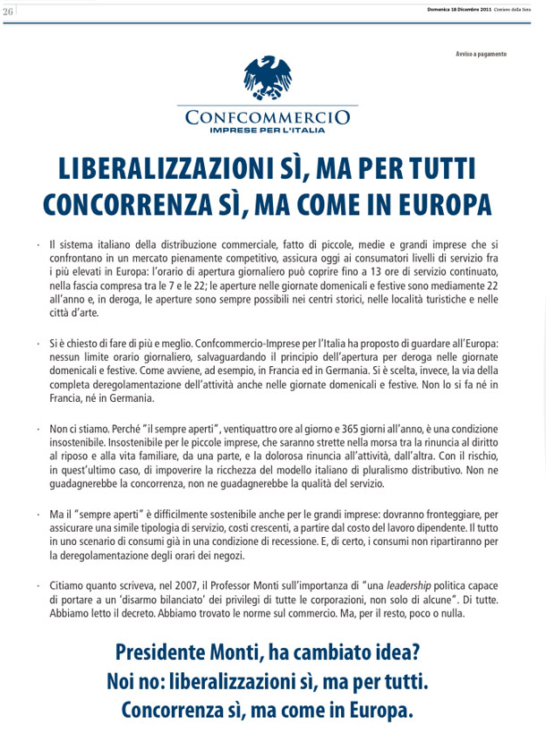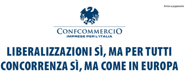 Confcommercio, l’associazione di categoria dei commercianti, del turismo e del terziario, ha comprato oggi un annuncio a pagamento sui maggiori quotidiani italiani per rivolgersi direttamente al governo presieduto da Mario Monti. La cosa è interessante perché l’annuncio parla di liberalizzazioni, tema di cui si è discusso molto in occasione dell’approvazione dell’ultima manovra economica e di cui si discuterà sicuramente ancora in futuro. Nell’annuncio Confcommercio si schiera contro la liberalizzazione degli orari degli esercizi commerciali e chiede al governo di intervenire in modo generalizzato e non solo su alcuni settori.