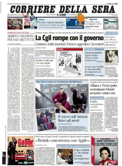 Il governo fa le notizie: quasi tutti i giornali aprono con le rassicurazioni del ministro Corrado Passera sull’eventualità che ci siano altre manovre, mentre Repubblica annuncia l’intensificarsi della caccia agli evasori fiscali e la Stampa parla dei ticket sanitari. Come sottolineano il Corriere e l’Unità, l’altro tema importante è la riforma del lavoro e il dissenso dei sindacati su quanto detto ieri da Elsa Fornero al Corriere. Il Giornale offre ai lettori un’intervista al segretario del PdL Angelino Alfano e l’Unità pubblica la lettera del ministro per la Cooperazione internazionale Andrea Riccardi sul tema della cittadinanza agli immigrati. Tutti i quotidiani parlano anche della morte di Vaclav Havel, protagonista della Rivoluzione di Velluto del 1989. Le pagine sportive sono soddisfatte dalla densa giornata di partite di ieri, che si è chiusa con la Juventus sola in testa alla classifica.