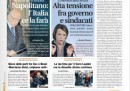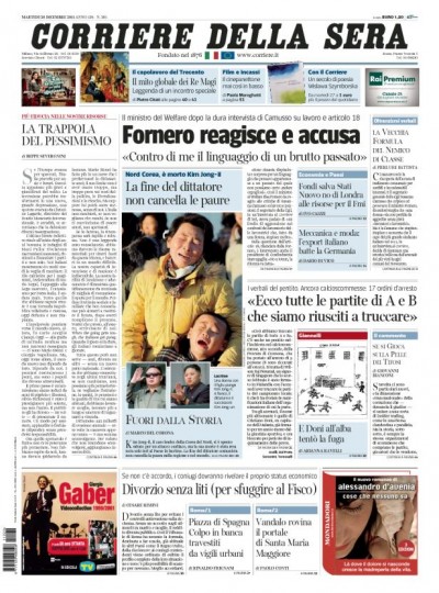 Le prime pagine di oggi aprono ancora sul tema del lavoro con le dichiarazioni del ministro Elsa Fornero, “dispiaciuta e sorpresa” per le parole dei sindacati contro di lei in occasione dello sciopero di ieri. Sui giornali si parla di “scontro”, di “alta tensione” e il Secolo d’Italia ripropone la foto del ministro del Lavoro in lacrime. Mentre la Stampa e (con orgoglio) la Padania annunciano la campagna anti-Imu di alcuni sindaci leghisti, il Giornale parla di “caste nascoste” con stipendi troppo alti e Repubblica prepara l lettori al controllo dei conti correnti. Le immagini di oggi sono per la Corea del Nord, dove folle disperate hanno pianto la morte del “caro leader”. Le pagine sportive trattano il tema del calcioscommesse e degli arresti di ieri.