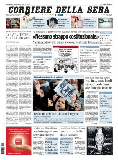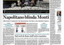 Il presidente della Repubblica è il protagonista indiscusso delle prime pagine di oggi, grazie al suo discorso di ieri. I maggiori quotidiani parlano di un Monti “blindato” e rafforzato da Napolitano, con l’eccezione della Padania. Mentre il Giornale continua con le inchieste sulla “casta”, Libero si preoccupa del debito pubblico tedesco (con tanto di caricatura della Merkel in abito tipico) e l’Unità, il Manifesto, Liberazione e il Secolo d’Italia si parlano ancora del tema del lavoro e dell’articolo 18. Le foto di oggi sono per le donne egiziane che hanno sfilato ieri in un corteo per solidarietà con una manifestante picchiata.