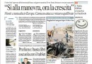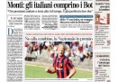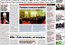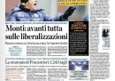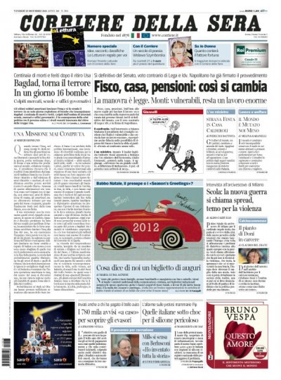 L’attenzione delle prime pagine di oggi è naturalmente per la nuova manovra, fresca di approvazione in Senato. Mentre il Corriere illustra cosa cambierà, e Repubblica, il Riformista e l’Unità preparano i lettori alla “fase due” della crescita annunciata da Mario Monti, c’è chi, come il Manifesto, ironizza sul “pacco” di Natale fatto agli italiani. Libero, La Padania e Liberazione, a cui la manovra proprio non piace, parlano di un Natale a “pane e cipolle” e di un governo di “squilibrati”, con riferimento alla mancanza di equità. Solo il Giornale parla d’altro, poiché ieri il testimone Mills avrebbe “scagionato” in aula l’ex-PresdelCons Berlusconi. Le pagine sportive non si fanno scoraggiare dalla carenza di partite e si occupano dei nuovi acquisti delle squadre.