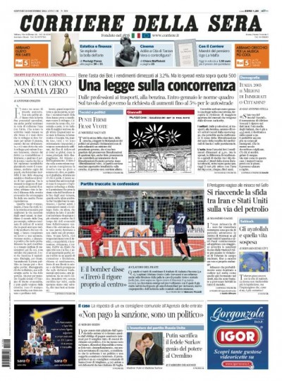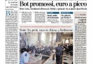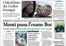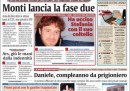 Le prime pagine di oggi aprono con varie notizie: Repubblica, Corriere della Sera e l’Unità si occupano delle anticipazioni della cosiddetta “fase due” del governo, soprattutto in materia di lavoro, mentre il Giornale, visto il silenzio stampa al termine del Consiglio dei Ministri, suppone che Monti si sia già “impantanato” nelle misure per la crescita e Libero dispensa consigli per pagare meno tasse. La Stampa e il Riformista si occupano del successo dell’asta dei bot e del cattivo andamento dei mercati mentre la notizia, secondo dati Istat, che nel 2065 il numero degli immigrati aumenterà preoccupa decisamente la Padania. Oggi compare anche un po’ di politica estera che riguarda le tensioni tra Stati Uniti e Iran sullo stretto di Hormuz. Da segnalare la lettera di Giorgio Napolitano su Repubblica e l’edizione particolare del Piccolo che festeggia 130 anni pubblicando la prima pagina del primo numero del giornale uscito il 29 dicembre 1881.