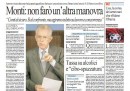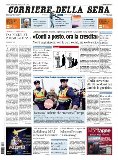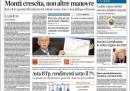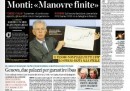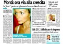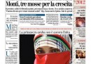 Le prime pagine di oggi aprono tutte con commenti sulle parole di Monti durante la conferenza stampa di fine anno. Il Corriere, la Repubblica, la Stampa e l’Unità cercano di riassumere il discorso di Monti e aprono con titoli piuttosto positivi ma gli altri quotidiani sono tutti critici. Il Giornale parla di crescita “della rabbia”, il Manifesto definisce il Presidente del Consiglio “il tedesco”, Liberazione non vede un ripresa ma un presa “in giro”, la Padania dice che Monti continua a gettare benzina sul fuoco. Mentre il Secolo d’Italia attende che Monti finisca lo “spot” per parlare delle misure concrete, Libero continua a dispensare consigli ai lettori per pagare meno tasse, concentrandosi oggi sulla riforma catastale.
