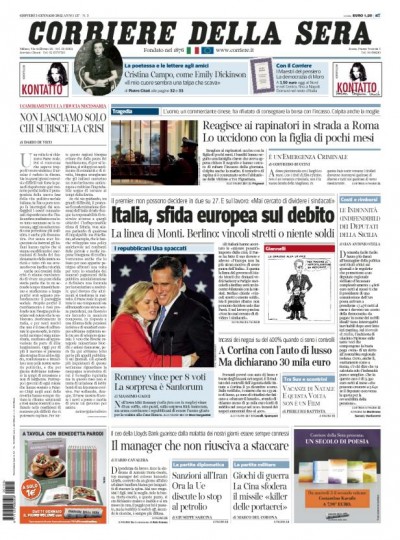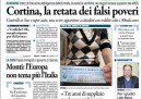 Le prime pagine di oggi trattano vari argomenti: il tema del lavoro è ancora al centro per Repubblica che parla dell’incontro di ieri tra Elsa Fornero e Susanna Camusso che si è dichiarata “pronta a trattare”. Il Corriere e l’Unità si occupano invece di Europa e dell’incontro tra Monti e Angela Merkel previsto per il prossimo mercoledì a Berlino e il Riformista parla del referendum “anti-porcellum”. Ma la notizia presente su ogni testata è quella del blitz della finanza a Cortina; il Giornale dedica il titolo principale ai “poveri in Mercedes”, l’Unità parla di “miracolo”.