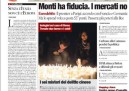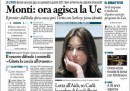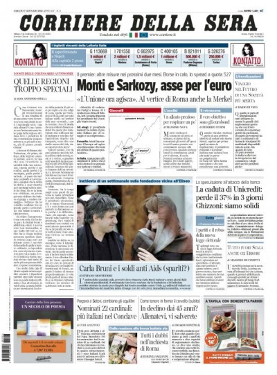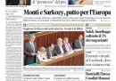 Al centro delle prime pagine di oggi c’è la visita francese di Mario Monti: il Corriere sottolinea l’accordo tra il premier italiano e Nicolas Sarkozy sui temi economici e finanziari mentre Repubblica e la Stampa riportano le parole di Monti, secondo cui è l’Europa ad essere troppo debole (l’Unità la definisce “malata” e il Giornale un “disastro”) e a dover agire unita per risolvere la crisi. Libero continua ad occuparsi degli stipendi della casta e la Padania attacca ancora il governo dei tecnici che vedono l’Italia come “carne da macello”. Il protagonista indiscusso delle testate sportive, ormai da settimane, è Carlos Tévez, conteso da Milan, Inter e Paris Saint-Germain.