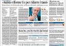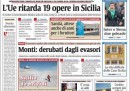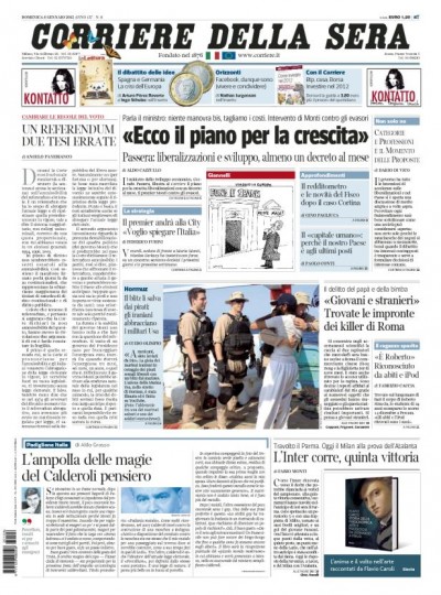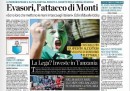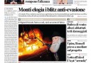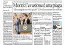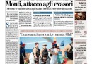 Il discorso di Mario Monti in occasione del 215° anniversario del primo Tricolore è in primo piano su quasi tutti i giornali di oggi: mentre Repubblica, la Stampa e l’Unità mostrano di apprezzare le parole di Monti contro gli evasori fiscali, Libero accusa il presidente del Consiglio di incoerenza e si chiede se “ci è o ci fa” e il Giornale fa i conti in tasca ai “furbetti del governo”. La Padania festeggia il suo quindicesimo compleanno, il Corriere della Sera pubblica un’intervista al ministro Corrado Passera, che promette crescita, e sull’Unità c’è un dialogo con il sindaco di Milano Giuliano Pisapia. L’Inter, con 5 reti, è la protagonista delle prime pagine sportive (ma non scherza nemmeno il Siena, che ne ha fatti 4 alla Lazio).