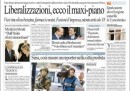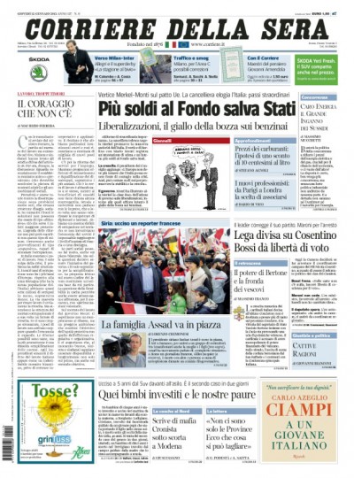 I temi in maggior rilievo sulle prime pagine di oggi sono temi su cui ci si arrovella da settimane, quindi non è che ci sia molto di nuovo: la gestione europea della crisi economica, con l’incontro di ieri tra Merkel e Monti, e le intenzioni del governo sulle liberalizzazioni, stamattina con nuove informazioni e dettagli. La notizia politica del giorno è la spaccatura della Lega sull’arresto di Cosentino. Il Giornale dopo Malinconico punta evidentemente a far fuori un altro ministro, e c’entra una casa. Si parla anche di referendum elettorali, l’Unità ci fa un titolo piuttosto ardito.