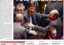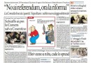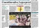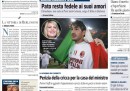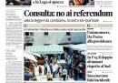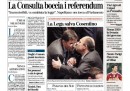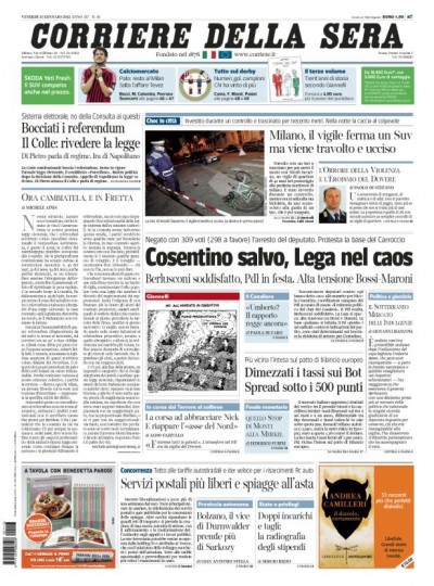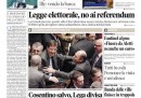 I giornali di oggi dedicano le prime pagine alla sentenza della Corte Costituzionale sui quesiti referendari e al al voto della Camera sull’arresto di Nicola Cosentino, il deputato PdL indagato per collusione con la camorra. Mentre Repubblica e la Stampa riportano le parole di Giorgio Napolitano che, dopo la bocciatura del referendum, esige la riforma elettorale, gli altri quotidiani pubblicano le immagini della gioia alla Camera per la salvezza di Cosentino e propongono un’interpretazione politica del voto in Parlamento: il Giornale, Libero e il Corriere vedono una spaccatura all’interno della Lega (che i primi due sembrano fomentare), che l’Unità si spinge a definire “il partito dei Casalesi”; il Riformista, con tanto di foto, si sofferma sulla rabbia di Antonio di Pietro per i due “no”. Sulle pagine sportive è tornato il caso di Pato che resta, clamorosamente, al Milan. Ma è il Giornale a buttarla sul sentimentale.