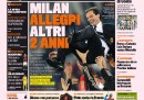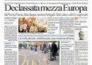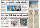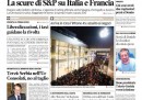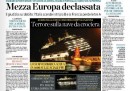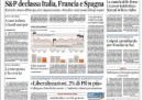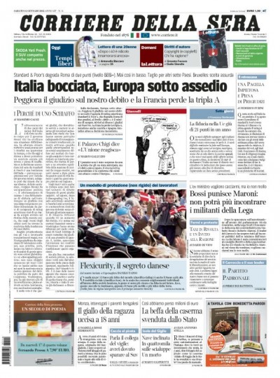 La notizia che domina la prime pagine di oggi è il declassamento dell’Italia a BBB+, da parte di Standard&Poor’s che toglie pure la tripla A alla Francia. Il Corriere parla di Europa sotto assedio, la Padania paragona l’Italia a spazzatura e l’Unità usa un lessico calcistico parlando di retrocessione in B. Il Giornale se la prende con Sarkozy, con la foto dell’ormai famoso sorriso del presidente francese quando ancora il premier era Berlusconi, e Libero continua ad occuparsi della casa del Ministro Patroni Griffi. Sulle testate sportive il protagonista è Massimiliano Allegri, che ieri ha rinnovato il contratto con il Milan fino al 2014.
