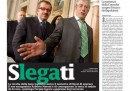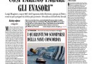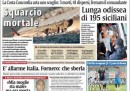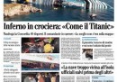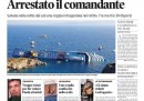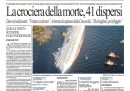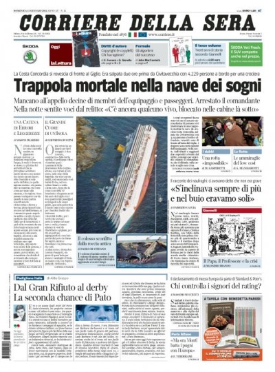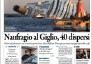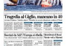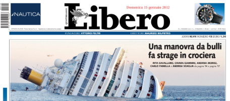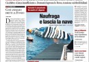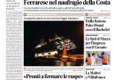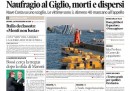 Sulla prime pagine di oggi domina la foto della nave Costa Concordia incagliata tra gli scogli: i giornali si dividono tra chi conta morti e dispersi, chi racconta dell’eroico salvataggio di una coppia di sopravvissuti e chi dà già la colpa al capitano “criminale”. Si sprecano scontatissimi paragoni con il Titanic. L’altra notizia di oggi è il litigio, chiamiamolo così, tra Bossi e Maroni: Liberazione consiglia al secondo, con un gioco di parole, di “slegarsi” e Libero afferma che Bossi sta “uccidendo” il suo partito; la Padania invece non se ne occupa, preferendo parlare di secessione e del diritto di libertà dei “popoli padani”.