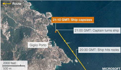 14.51 – Il sito della BBC propone una serie di grafiche interessanti sul naufragio della Costa Concordia. C’è anche una ricostruzione della rotta seguita probabilmente dalla nave dopo la collisione con gli scogli.