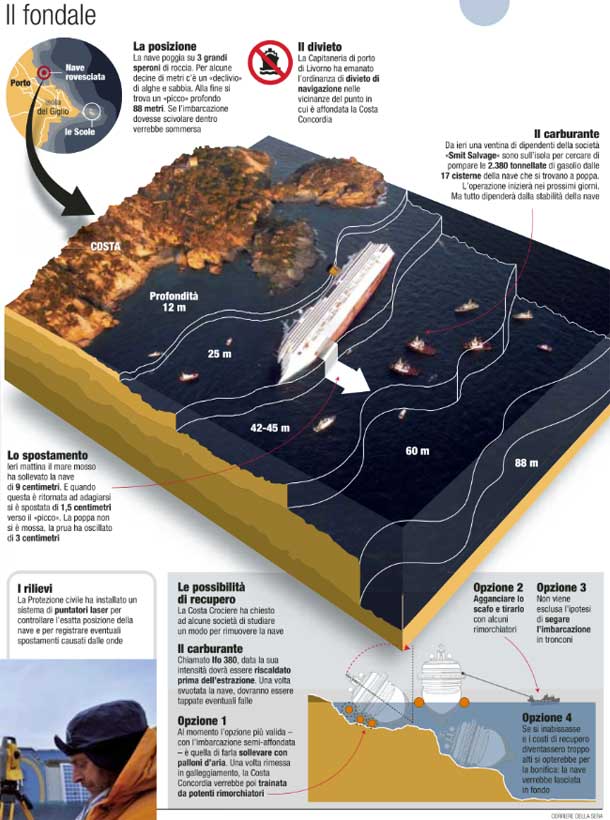 10.14 – Questa infografica sul Corriere della Sera di oggi chiarisce bene l’attuale posizione della Concordia sul fondale di fronte l’isola del Giglio.