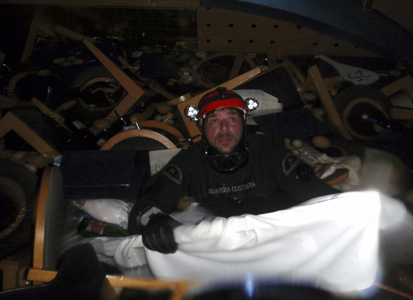 9.48 – Su molte prime pagine, oggi, campeggia questa foto di un soccorritore della Guardia Costiera all’interno della Concordia. La foto è stata scattata dalla Guardia Costiera e diffusa da Associated Press.