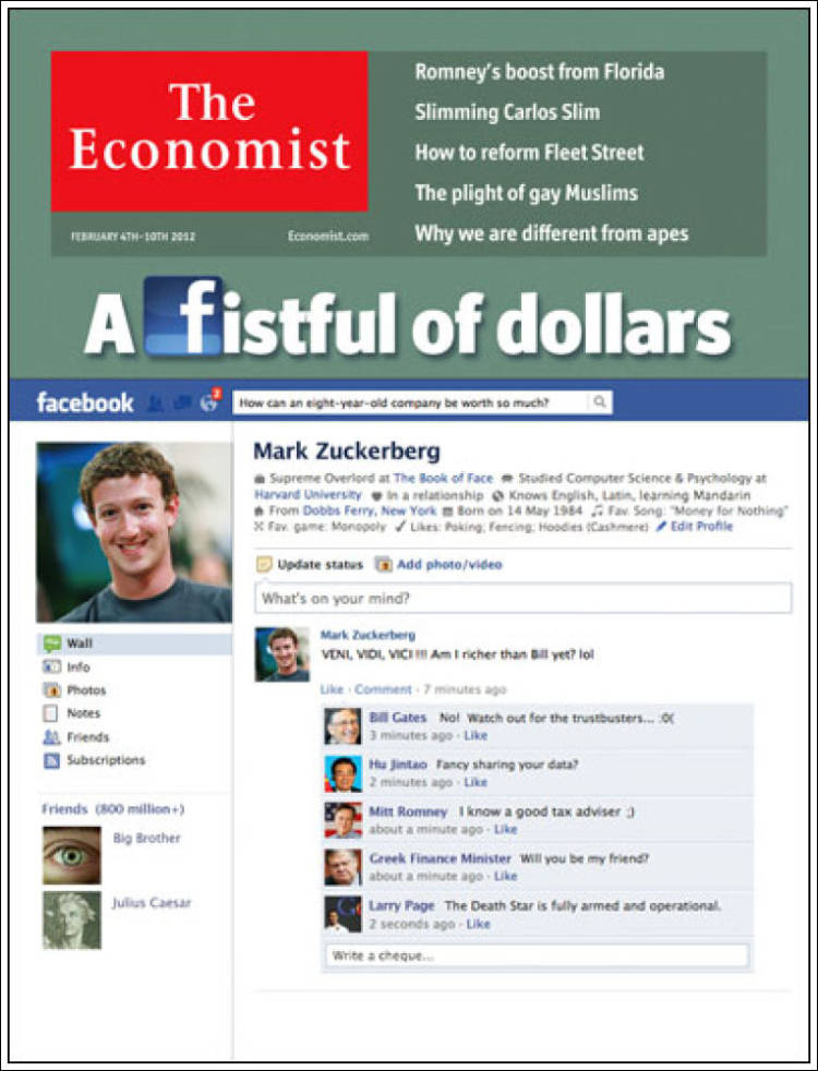 L’Economist dedica la copertina di questa settimana a Facebook, che mercoledì scorso ha presentato la documentazione necessaria per avviare una offerta pubblica iniziale (IPO), il primo passo per potersi quotare in borsa. La società potrebbe raccogliere oltre 5 miliardi di dollari e arrivare, nella migliore delle ipotesi, a una valutazione intorno ai 100 miliardi di dollari. Per il titolo, l’Economist ha scelto quello di un famoso film western di Sergio Leone: “Per un pugno di dollari”.