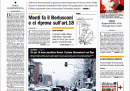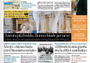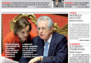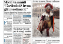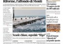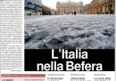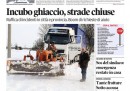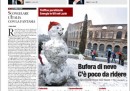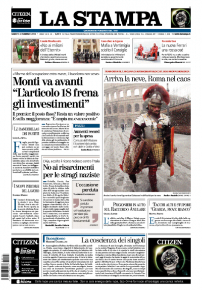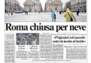 Le prime pagine dei giornali di oggi aprono quasi tutte sulla nevicata a Roma e sui disagi che ha provocato. La Repubblica, l’Unità, il Sole 24 Ore e la Stampa propongono le dichiarazioni rilasciate da Monti su articolo 18 e riforma del lavoro in un videoforum di Repubblica Tv, mentre il Manifesto e il Giornale si occupano della sentenza del tribunale dell’Aja sugli indennizzi da parte della Germania ai parenti delle vittime del nazismo. La neve occupa anche le prime pagine dei giornali sportivi, con il rinvio di Roma-Inter e di altre partite di oggi.