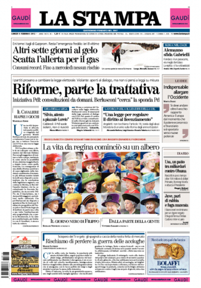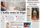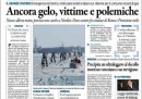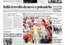 Quasi tutte le prime pagine di oggi aprono con la neve e il gelo, e le polemiche fra il sindaco di Roma Gianni Alemanno e il capo della Protezione civile Gabrielli. La Stampa e il Giornale puntano invece sulle iniziative per le riforme della politica del PdL, con le dichiarazioni di ieri di Silvio Berlusconi. I quotidiani sportivi si occupano dei risultati della domenica e delle decisioni degli arbitri riguardanti Milan e Juventus.