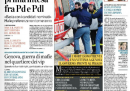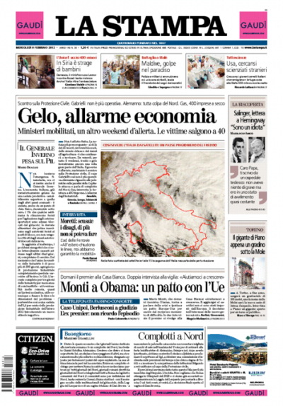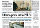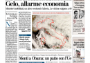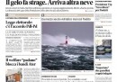 Le prime pagine di oggi aprono in maggioranza sull’ondata di gelo e neve che sta colpendo l’Italia in questi giorni, e sulle polemiche sul ruolo e i poteri della Protezione Civile. Il Corriere della Sera, il Mattino, il Secolo XIX e Libero puntano invece sull’incontro fra Pd e Pdl per modificare la legge elettorale, mentre l’Unità si occupa del rinvio a giudizio di Berlusconi per l’intercettazione della telefonata sul caso Unipol e il Giornale continua ad indagare sui retroscena della caduta del governo Berlusconi.