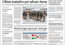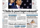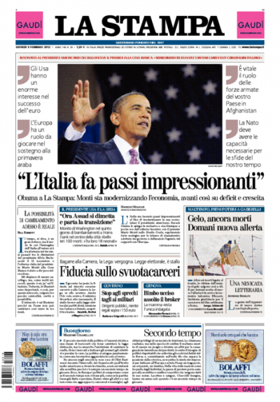 La Stampa apre con un’intervista a Barack Obama sull’Italia alla vigilia del suo incontro con il presidente del consiglio Mario Monti, il Corriere della Sera, il Mattino e l’Unità si occupano dei tagli alle spese dei ministeri, la Repubblica apre sugli aumenti dei prezzi causati dal freddo e dal maltempo, mentre il Manifesto dedica la prima pagina alla crisi del giornale. I quotidiani sportivi commentano la vittoria della Juventus sul Milan in coppa Italia e le dimissioni di Capello da allenatore dell’Inghilterra.