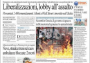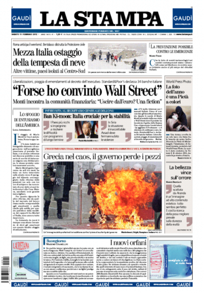 Le notizie di apertura sui giornali di oggi sono diverse: il viaggio di Monti negli Stati Uniti e gli incontri a Wall Street per la Stampa e l’Unità, la neve per il Corriere della Sera e il Messaggero, il decreto sulle liberalizzazioni per la Repubblica e il Mattino. Il Manifesto e il Sole 24 Ore si occupano invece della crisi e degli scontri in Grecia, mentre il Fatto Quotidiano, Libero e il Giornale tornano sul presunto complotto per uccidere il Papa.