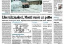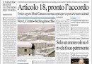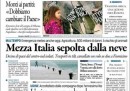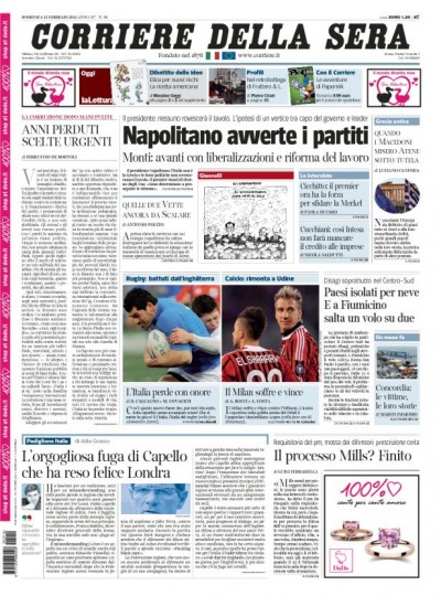 Il maltempo non mette d’accordo i principali quotidiani di oggi, che titolano tutti con una notizia diversa: sul Corriere della Sera e la Stampa la notizia principale è un “avvertimento” di Napolitano alle forze politiche perché continuino con il sostegno al governo Monti; il quale primo ministro, secondo Repubblica, avrebbe tenuto un “vertice segreto” con Susanna Camusso e avrebbe già concluso un accordo su eventuali modifiche all’articolo 18. Altri quotidiani danno grande spazio in prima pagina alla grave crisi politica e sociale che è in corso in Grecia, mentre almeno due si allontanano dall’attualità: l’Unità con un ricordo dell’inchiesta Mani Pulite, “L’occasione mancata”, e il Giornale, che parla della pressione fiscale. Sui giornali sportivi, la notizia del giorno è la rimonta del Milan ieri sera contro l’Udinese (la partita è finita 2-1).