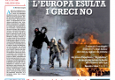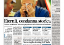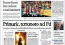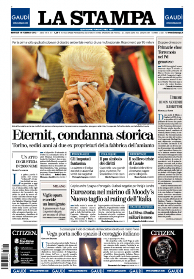 I giornali di oggi aprono quasi tutti con le condanne al processo contro i vertici dell’Eternit. Fanno eccezione il Giornale e Libero, che si occupano delle polemiche nel Partito Democratico dopo i risultati delle primarie a Genova, e il Secolo d’Italia, che rimane sulla Grecia dopo l’approvazione delle misure di austerità di domenica. Su molti quotidiani si parla dell’inizio del festival di Sanremo, e della decisione del governo sulla candidatura di Roma per le olimpiadi del 2020.