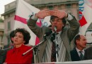 Ma nelle pose che lo vedono incitare una folla di sostenitori e curiosi, il suo stile è quello del cantante. Lo si capisce da come si atteggia davanti al microfono. Lo afferra con le due mani, si avvicina quasi per sussurrare, anche se poi la voce esce alta dall’impianto di amplificazione. Uno stile decisamente diverso da quello dei politici degli anni precedenti, democristiani, comunisti, socialisti, missini, che, sì, parlano davanti al microfono, ma sempre a debita distanza, come si trattasse di un oggetto interdetto, attraverso cui la voce per effetto magico si diffonde nell’etere. Somigliano, in alcuni casi, ai predicatori che arringano la folla dal pulpito, e le loro posture sono rivolte più al pubblico che non all’oggetto che hanno dinanzi.