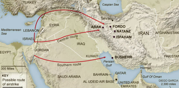 In caso di attacco, ci sarebbe innanzitutto il problema della notevole distanza tra Israele e Iran. Per quanto riguarda le rotte ci sarebbero tre possibilità: la prima, la più lunga e dispendiosa, prevede il passaggio degli aerei sulla Turchia, evitando la Siria, passando inizialmente sul Mar Mediterraneo; la seconda prevede il passaggio su Arabia Saudita e brevemente su Giordania e Kuwait, mentre per la terza si dovrebbero attraversare gli spazi aerei di Giordania e Iraq.