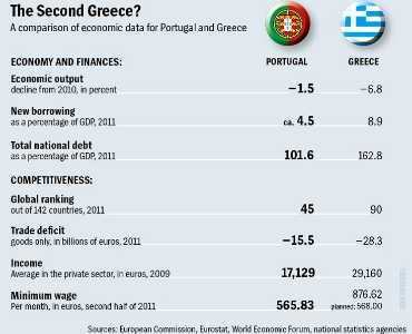 I 78 miliardi di euro offerti dalla comunità internazionale dureranno fino a settembre 2013, poi non si sa che cosa succederà. Dopo che Il Prodotto interno lordo portoghese era sceso notevolmente nel 2009 (-2,51 per cento), il paese aveva ripreso lentamente a crescere nel 2010 (+1,39 per cento). Ma nel 2011 è tornata la recessione, la peggiore dopo quella del 1975. Solo nell’ultimo trimestre nel 2011 il PIL sarebbe sceso dell’1,3 per cento, dopo che nel trimestre precedente era già calato dello 0,6 per cento, per una decrescita complessiva stimata durante il 2011 di almeno il 3 per cento.