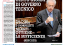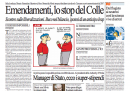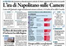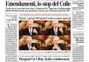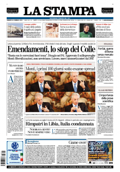 Non c’è un argomento unico sulle prime pagine dei giornali di oggi: la Repubblica, la Stampa e il Secolo XIX aprono con la lettera di Napolitano ai presidenti di Camera e Senato sull’uso eccessivo da parte del Parlamento di emendamenti fuori tema rispetto ai decreti del governo, il Manifesto, l’Unità e la Padania si occupano della sentenza della Corte Europea per i Diritti dell’Uomo che condanna l’Italia per i respingimenti in Libia, il Messaggero rimane sulle polemiche sul decreto sulle liberalizzazioni, mentre il Corriere della Sera ha un’intervista all’amministratore delegato della FIAT Marchionne. I quotidiani sportivi aprono con la conferma della squalifica per Ibrahimovic, che sarà così assente per la partita di domani fra Milan e Juventus.
