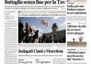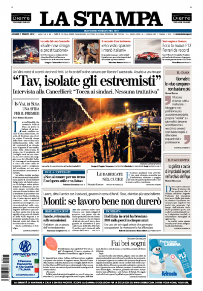 L’apertura di quasi tutti i giornali di oggi è sulle manifestazioni No TAV in Val di Susa, con gli scontri, i blocchi stradali e le minacce ai giornalisti: Libero accusa Monti per il suo silenzio sull’argomento e la Stampa intervista il ministro dell’interno Cancellieri. Il Messaggero, il Mattino e il Secolo XIX seguono invece le dichiarazioni sulla riforma fiscale di Monti, che mira a ridurre l’IRPEF e aumentare le imposte indirette, mentre il Riformista si occupa del decreto sulle liberalizzazioni e il Secolo d’Italia continua la sua campagna sui marinai italiani arrestati in India. I quotidiani sportivi aprono con la sconfitta in amichevole dell’Italia con gli Stati Uniti.