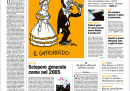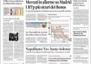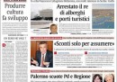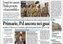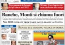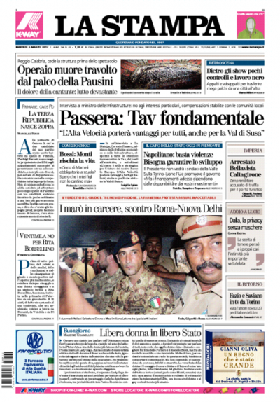 Le aperture dei giornali di oggi sono dedicate a notizie diverse: il Corriere della Sera, il Giornale, Libero e il Secolo d’Italia si occupano della vicenda dei marinai italiani arrestati in India, per i quali ieri il tribunale ha deciso il trasferimento in carcere, Repubblica e il Messaggero seguono le dichiarazioni del Presidente della Repubblica sulla TAV, e la Stampa apre con un’intervista al ministro delle infrastrutture Passera sullo stesso argomento. L’Unità e il Riformista tornano sui risultati delle primarie a Palermo con le polemiche nel PD per la sconfitta del candidato appoggiato dal partito, mentre il Mattino e il Secolo XIX si occupano della scoperta da parte dell’Agenzia del Territorio di un milione di case non dichiarate al catasto in Italia.