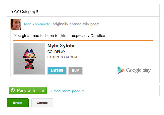 Quelli di Google hanno naturalmente pensato anche a Google+, il social network lanciato la scorsa estate e che per ora fatica ad affermarsi. Tutte le cose trovate su Google Play potranno essere condivise sul proprio profilo di Google+, dove saranno disponibili con anteprime e informazioni aggiuntive per chi volesse scaricarle. Per i file musicali acquistati c’è anche un’opzione per farli sentire una volta per intero sul social network agli amici nelle proprie cerchie.
