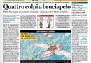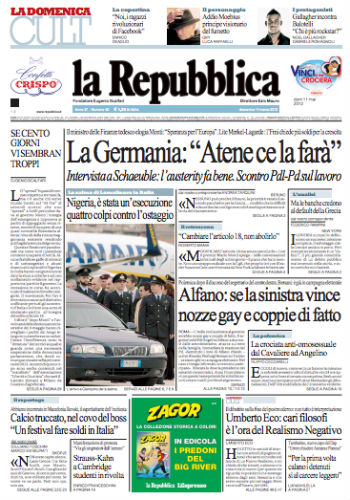Le aperture delle prime pagine dei quotidiani di oggi sono piuttosto varie. Repubblica apre con un’intervista al ministro delle Finanze tedesco Wolfgang Schäuble, che si dice ottimista per il futuro della Grecia. Il Corriere della Sera e altri quotidiani locali dedicano invece l’apertura agli aggiornamenti sulla vicenda dell’ingegnere Lamolinara, ucciso “da quattro colpi” di arma da fuoco in Nigeria da un blitz delle forze speciali inglesi. La Stampa si concentra invece sull’Asia (i problemi economici della Cina e l’anniversario del terremoto che ha provocato il disastro di Fukushima, in Giappone), mentre Libero e il Giornale chiedono soldi: il primo a partiti e sindacati mediante una “patrimoniale”, il secondo alle banche. Tutti i giornali sportivi aprono con il duello Juventus-Milan nella Serie A di calcio che si ripeterà oggi pomeriggio quando le due squadre saranno impegnate rispettivamente con Genoa e Lecce.