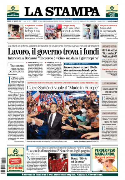 Le notizie di apertura sui giornali di oggi sono diverse: Repubblica, il Corriere della Sera e il Secolo XIX si occupano della strage compiuta in Afghanistan da un militare americano, che ha ucciso 16 civili nella provincia di Kandahar, il Messaggero e il Mattino seguono ancora la morte dell’ostaggio italiano in Nigeria, con la notizia della trattativa in corso per liberarlo confermata da un video mostrato dal Ministero degli Esteri alla famiglia il mese scorso, la Stampa apre con la trattativa per la riforma del lavoro e con un’intervista al segretario della CISL Bonanni, mentre il Giornale si concentra sui problemi della Lega e l’Unità su quelli della RAI. I quotidiani sportivi aprono con la vittoria del Milan, che aumenta il vantaggio in classifica sulla Juventus, in silenzio stampa per i presunti errori arbitrali nei suoi confronti.