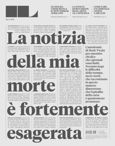 IL è il magazine mensile del Sole 24 Ore, stimato e seguito da tempo soprattutto per la sua qualità grafica (pensata e seguita dall’art director Francesco Franchi) e di cui il Post mostrò già il redesign dello scorso ottobre. Adesso IL ha un nuovo direttore – Christian Rocca, per molti anni al Foglio e assai presente in rete col suo blog e non solo – e quello che esce venerdì è il suo primo numero, dedicato alla crisi dei giornali di carta. Anzi no, dedicato al successo dei giornali di carta.
