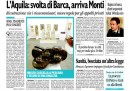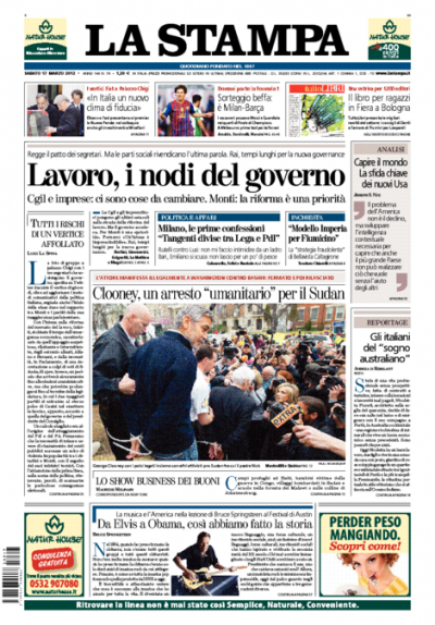 Molti giornali di oggi aprono ancora con la riforma del lavoro che, dopo l’ottimismo degli ultimi giorni, sembra trovare una nuova battuta d’arresto con i dubbi e le critiche della CGIL e delle imprese. Il Manifesto e l’Unità si occupano invece dell’incontro di oggi fra i leader dei partiti di sinistra italiano, francese e tedesco, a sostegno della candidatura presidenziale in Francia di François Hollande, mentre il Giornale, Libero e il Mattino titolano sulle indagini sulla corruzione nei partiti, i primi due su varie indagini che coinvolgono i partiti della sinistra, il terzo sulle dichiarazioni di un testimone che spiegherebbe il sistema di spartizione in Lombardia fra Lega e PDL. Il Secolo XIX dedica interamente la prima pagina al ricordo delle vittime della mafia, in occasione della manifestazione promossa a Genova dall’associazione Libera. I quotidiani sportivi aprono con il sorteggio per i quarti di finale della Champions League, che vedrà opposte Milan e Barcellona, e con la polemica continua fra Milan e Juventus sugli arbitri.